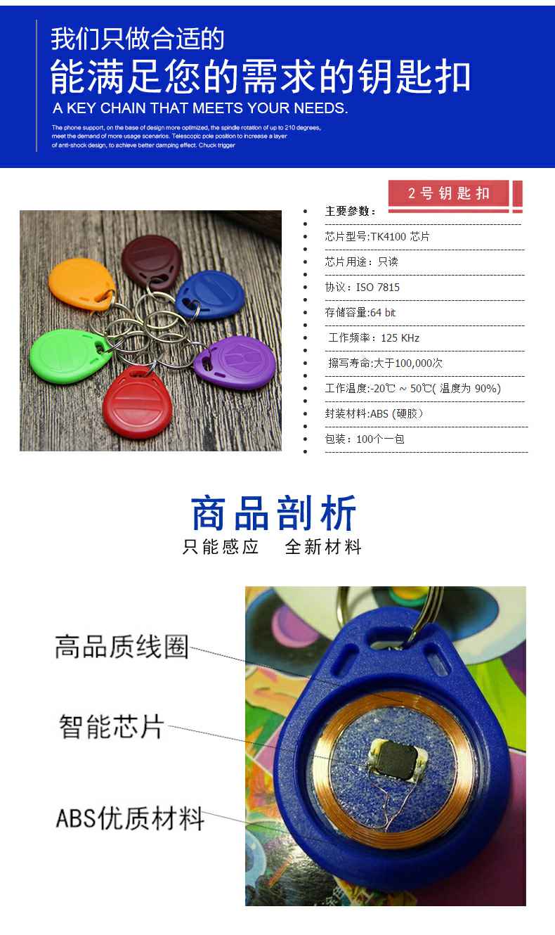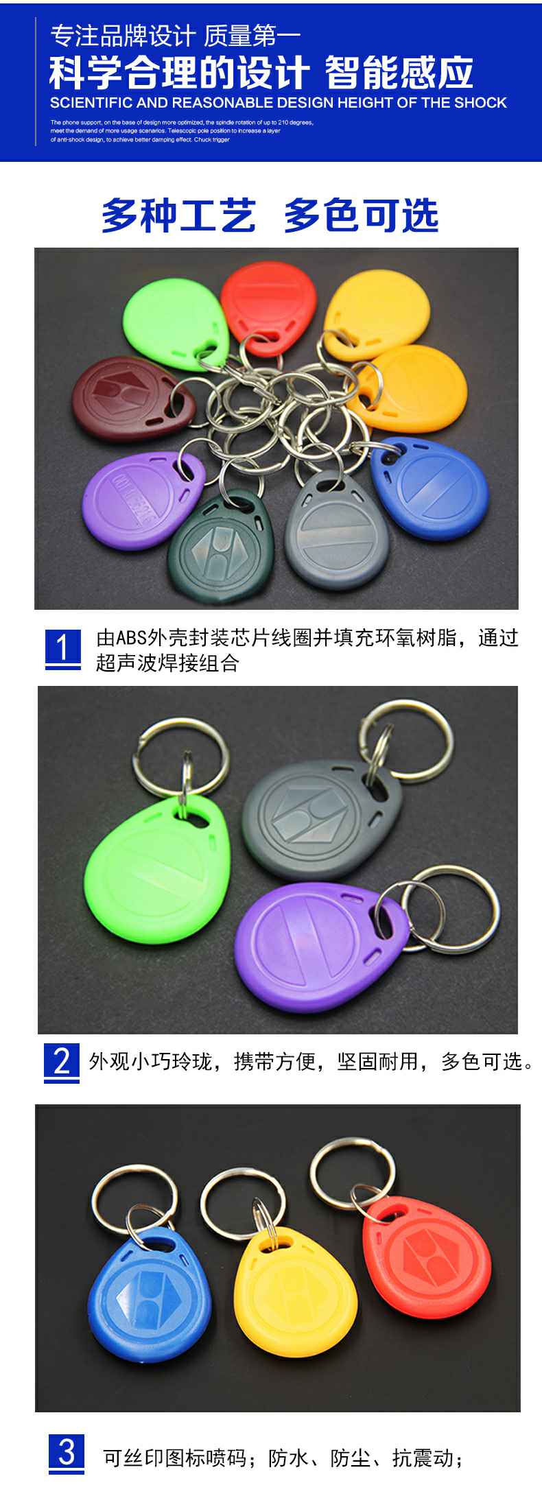 由ABS外壳封装芯片线圈并填充环氧树脂,通过超声波焊接组合;外观小巧玲珑,携带方便,坚固耐用,多色可选。可丝印图标喷码;防水、防尘、抗震动;