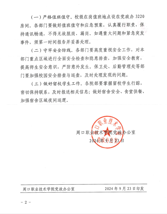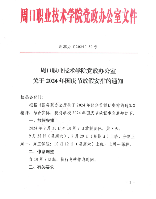 十大买球的正规网站党政办公室关于2024年国庆节放假安排的通知
