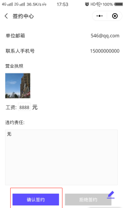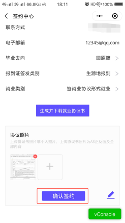 学生在后台点击【查看】已更新签约信息。确认无误点击【确认签约】提交至院校审核。