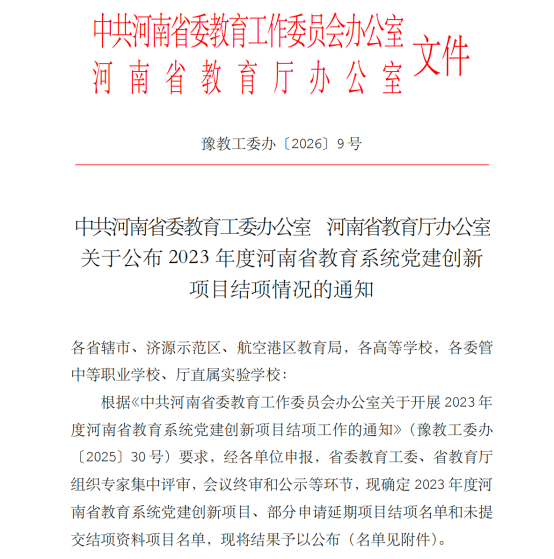 2月26日,中共河南省委教育工作委员会办公室 河南省教育厅办公室公布《关于公布2023年度河南省教育系统党建创新项目结项情况的通知》(豫教工委办〔2026〕9 号),校党委副书记李明臣带领经管学院老师主持的项目顺利结项。